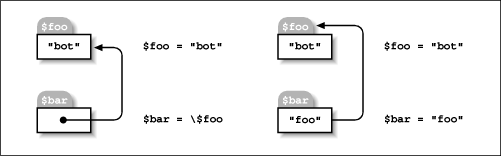 The other kind of reference is a hard reference, and this is what most Perl programmers use to accomplish their indirections (if not their indiscretions). We call them hard references not because they're difficult, but because they're real and solid. If you like, think of hard references as real references and symbolic references as fake references. It's like the difference between true friendship and mere name-dropping. When we don't specify which type of reference we mean, it's a hard reference. Figure 8-1 depicts a variable named $bar referring to the contents of a scalar named $foo which has the value "bot".